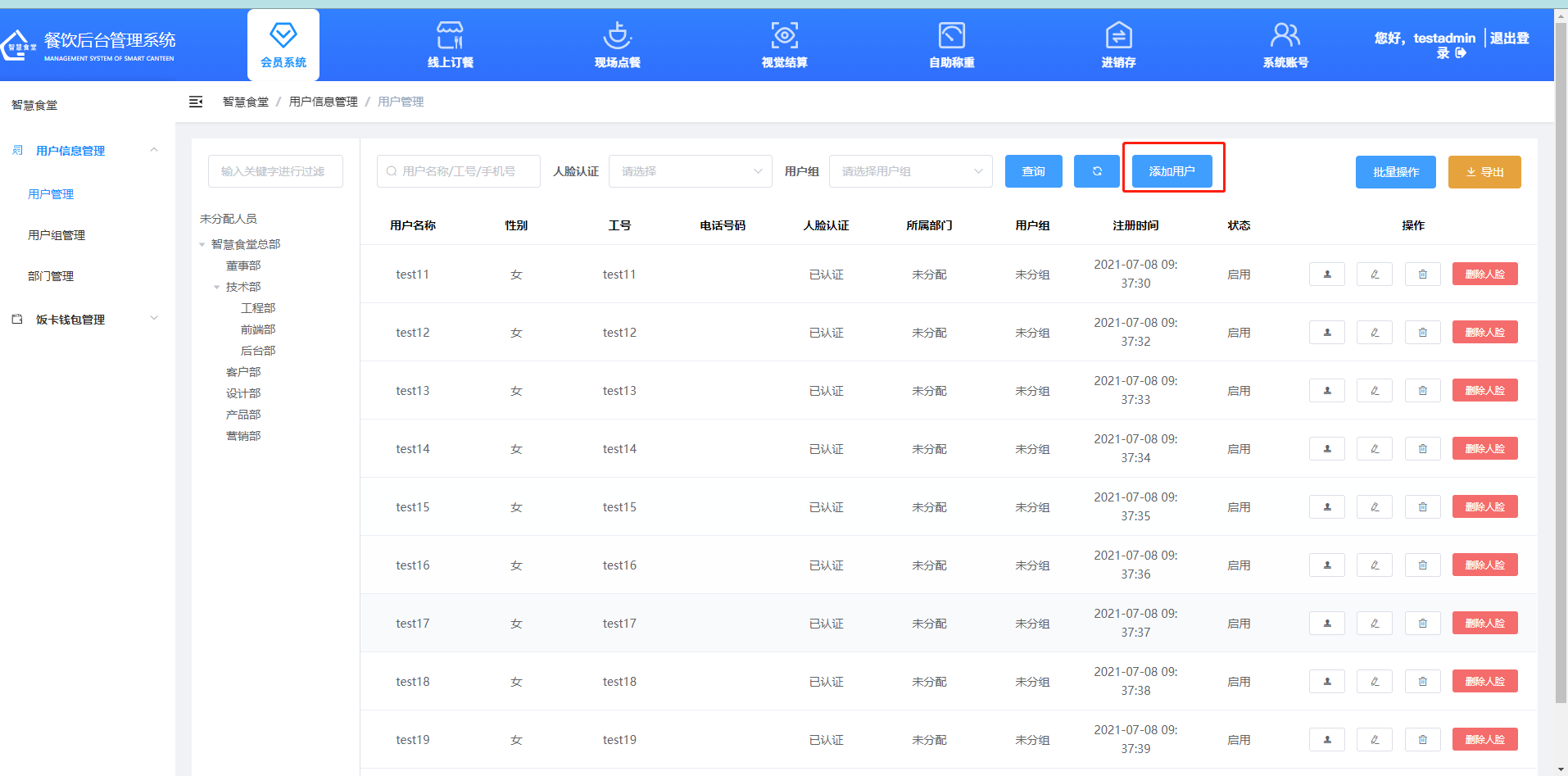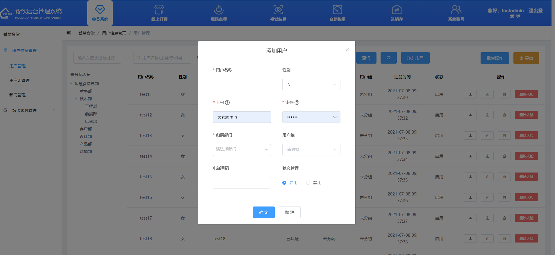 ①點擊“添加用戶”卡片,彈窗添加用戶名稱、工號、電話號碼、性別、歸屬部門、用戶組、密碼信息,可設置用戶狀態啟用或禁用,當設置啟用是正常使用,設置禁用時用戶無法進行登陸,可批量用戶導入;