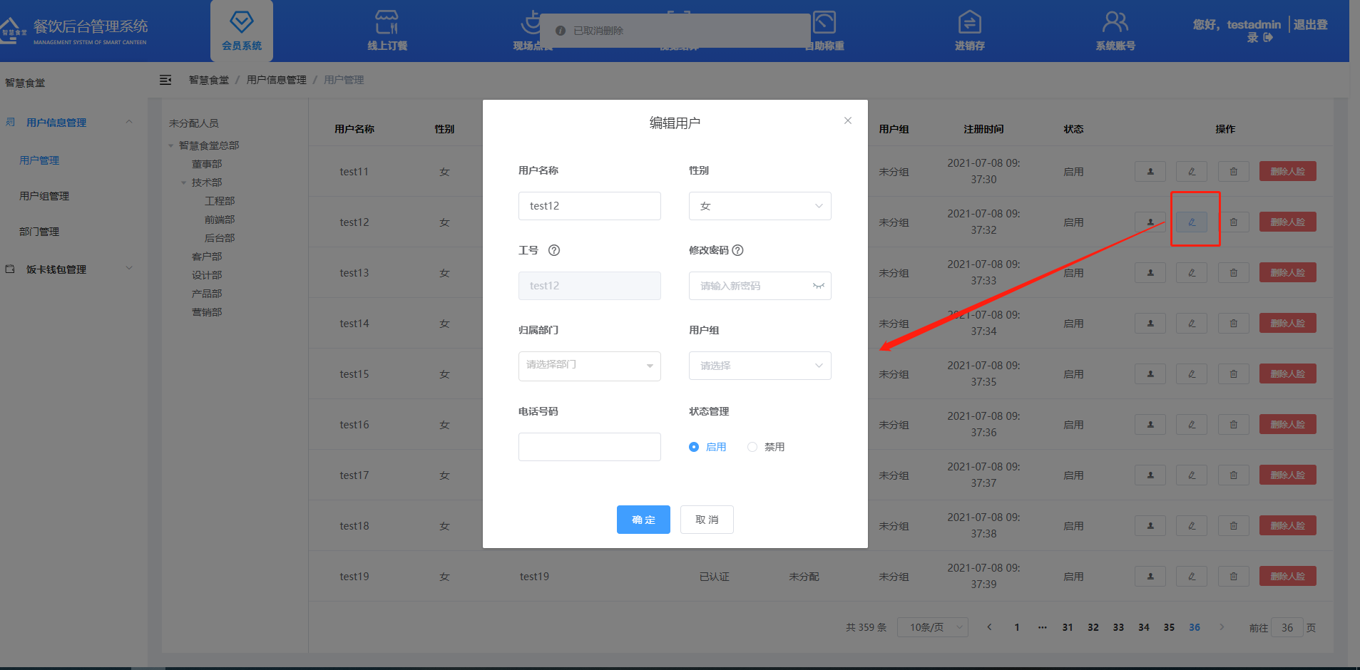 ⑤點擊右側操作畫筆小圖標進行用戶編輯,可以修改用戶名、電話號碼、性別、歸屬部門、用戶組、密碼、狀態管理等信息;