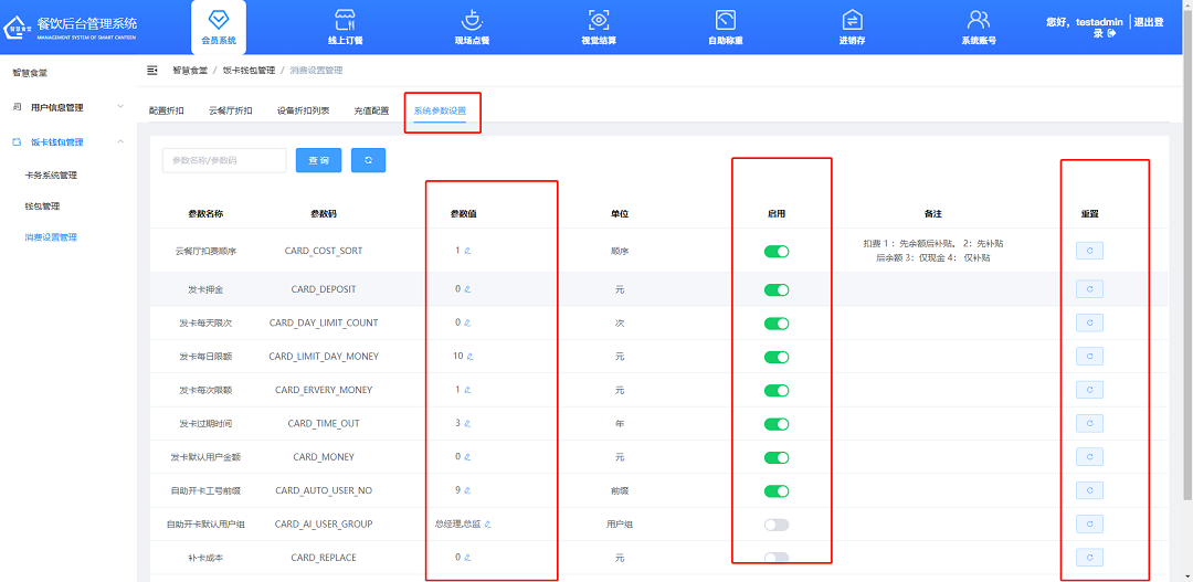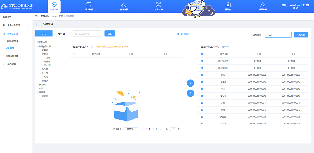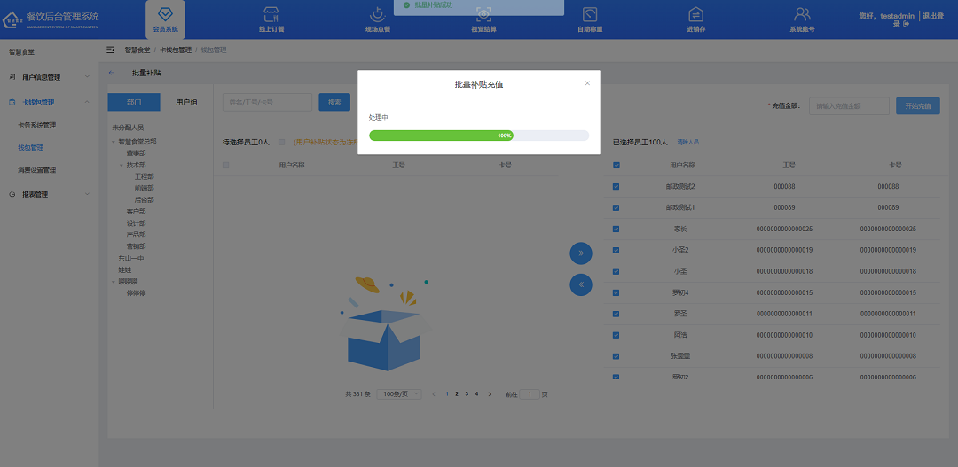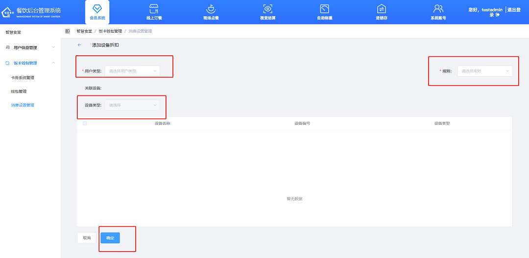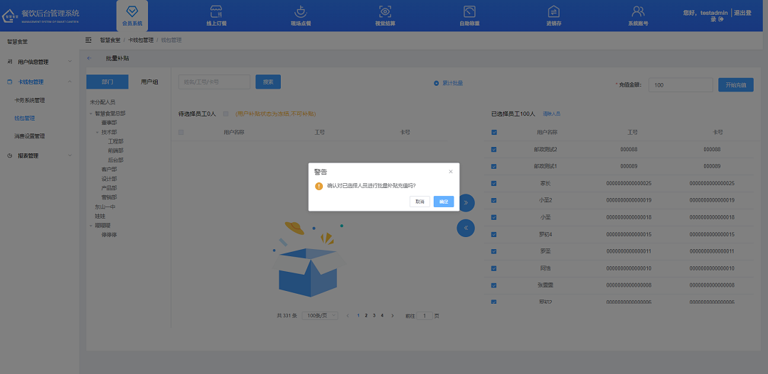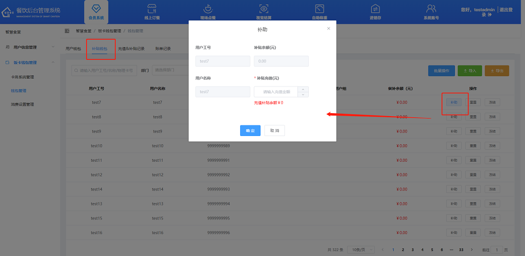 ①飯卡充值,點擊“充值”按鈕對用戶進行充值,填寫需充值的數額,選擇支付方式,點擊“確定”按鈕,完成充值;