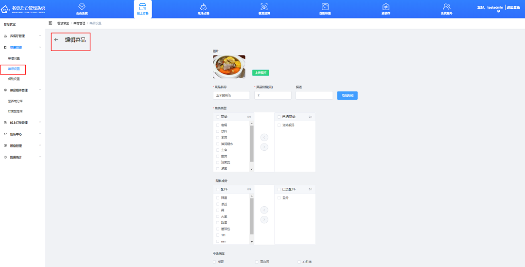 ④勾選不宜進食此菜品的特殊病癥(用于醫院),若無此需求可不勾選;