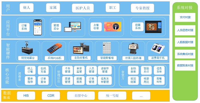 構(gòu)建醫(yī)患健康服務(wù)、病患就餐指導(dǎo)服務(wù)、禁忌餐食防控、數(shù)字化訂餐服務(wù)、區(qū)域堂食自助就餐等多種后勤餐飲全程閉環(huán)管理,實現(xiàn)數(shù)字化改革融合與創(chuàng)新。