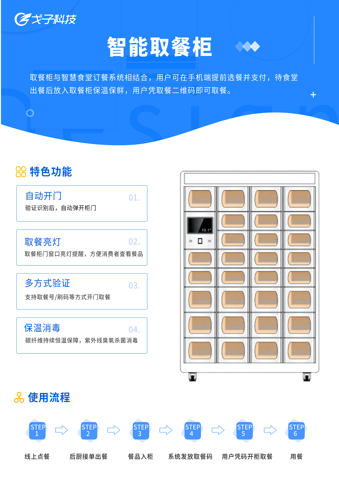 戈子科技智能取餐柜有保溫、加熱、制冷、消毒等多種功能,可以分散放置在食堂、員工辦公區(qū)內(nèi),緩解員工排隊擁擠,工作忙沒有時間去食堂取餐問題。訂餐人員根據(jù)收到的取餐二維碼在餐柜掃碼自提,簡單方便,隨時都可吃到的飯菜。