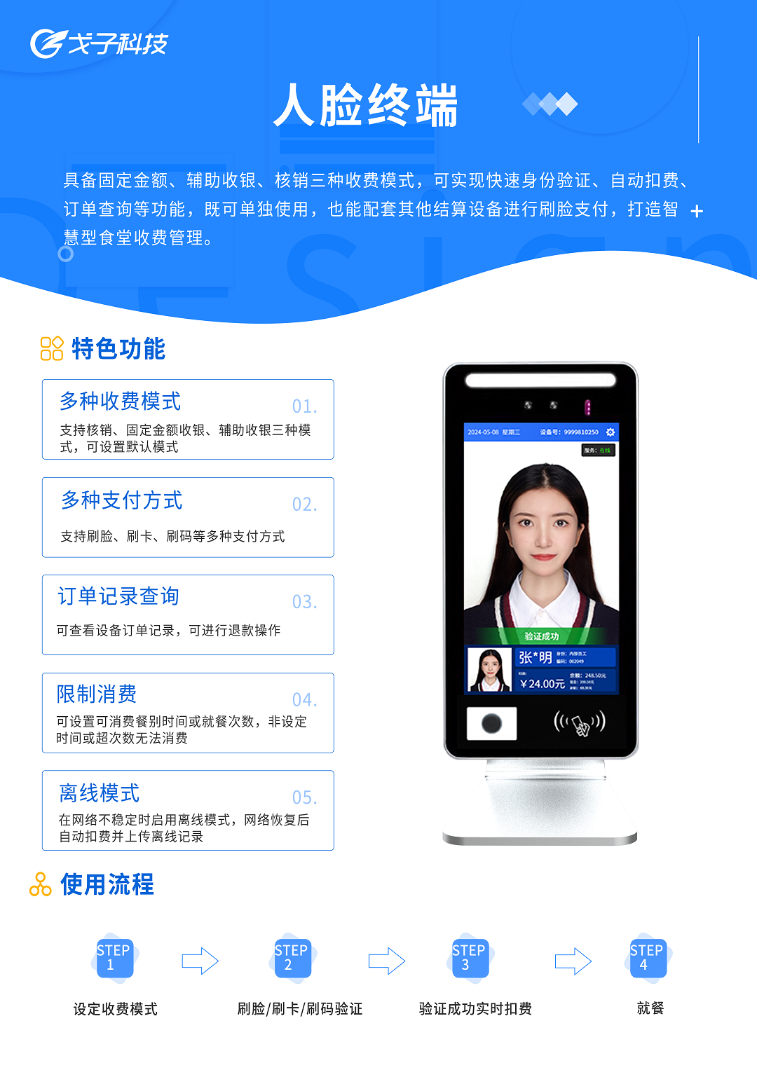 戈子科技人臉識別終端利用AI智能人臉識別技術(shù),專業(yè)提供精準(zhǔn)實時的人臉檢測,分析,識別等功能,其用于食堂快速收銀的人臉識別就餐管理,支持刷卡,掃碼和人臉支付,測評準(zhǔn)確度高達(dá)99.80%,覆蓋多種企業(yè)場景,高效解決企業(yè)常見痛點。