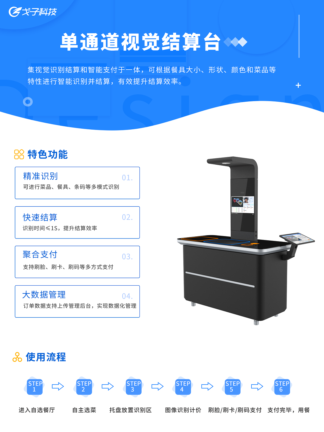 戈子科技單通道視覺結算臺集視覺識別結算和智能支付于一體,單臺設備能實現一條隊伍結算,智能識別結算,讓結算效率加倍提升。