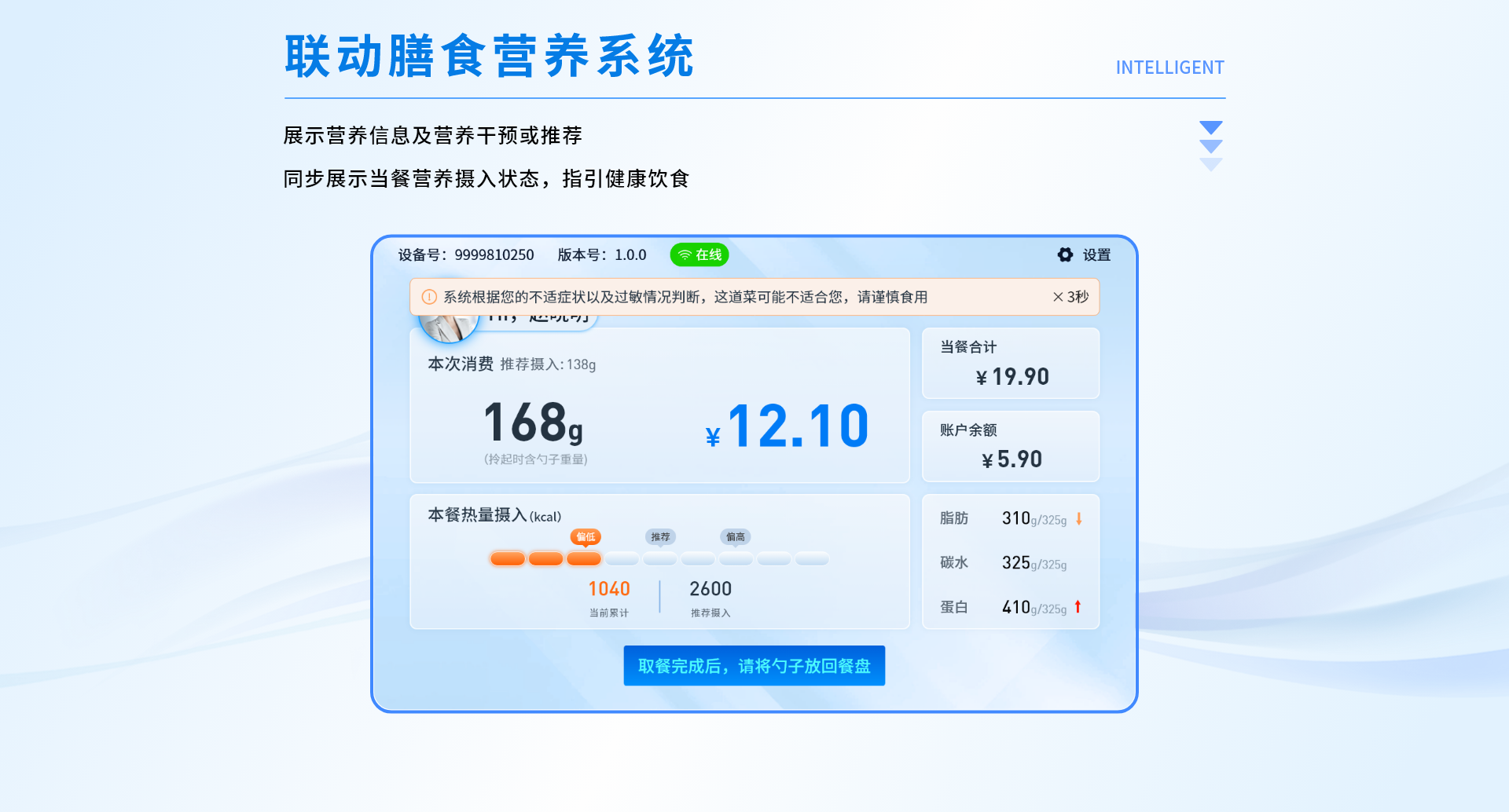 智能稱重結算臺一體化設計,基于餐飲云平臺為就餐者提供的無感支付、自助餐飲的智能化集成式系統。用戶綁定托盤后,通過托盤感應臺讀取托盤信息,即可在多個智能秤上自助稱重取餐,取餐完成后通過空中支付進行就餐結算。