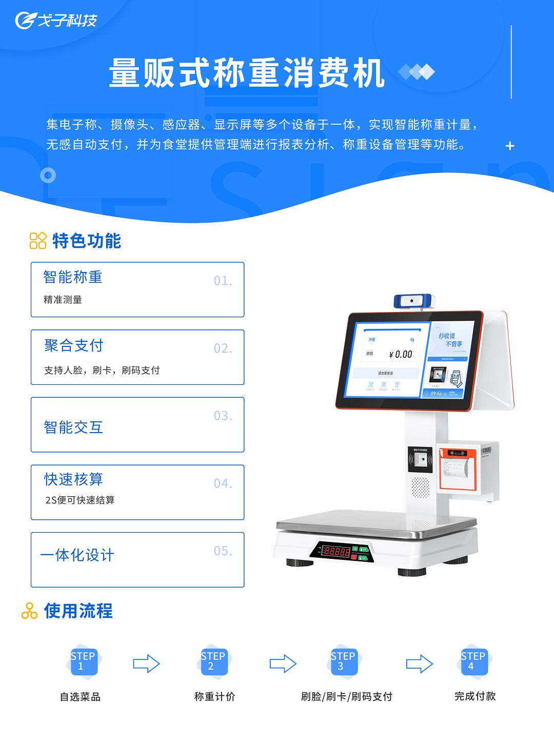 量販?zhǔn)椒Q(chēng)重消費(fèi)機(jī)集電子稱(chēng)、攝像頭、感應(yīng)器、顯示屏等多個(gè)設(shè)備于一體,實(shí)現(xiàn)智能稱(chēng)重計(jì)量,無(wú)感自動(dòng)支付,并通過(guò)顯示菜品的營(yíng)養(yǎng)成分和消費(fèi)記錄推薦提醒,并為食堂提供管理端進(jìn)行報(bào)表分析、稱(chēng)重設(shè)備管理等平臺(tái),引導(dǎo)就餐者適量取餐,科學(xué)用餐。