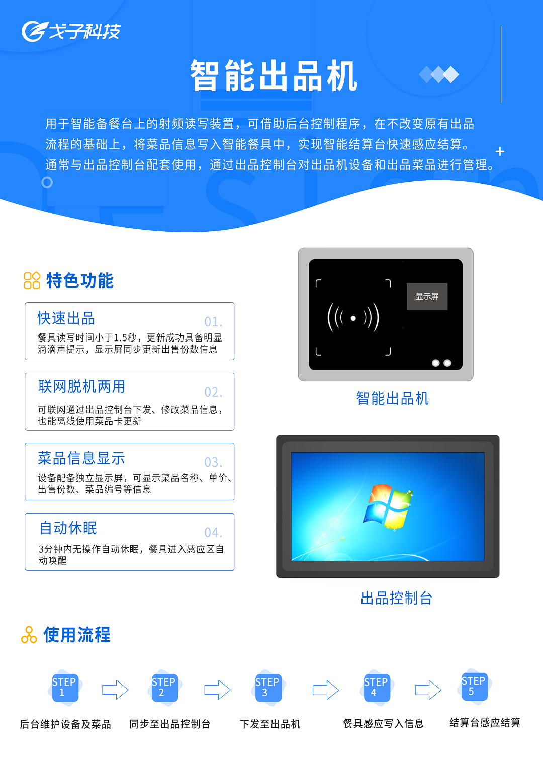 戈子科技智能出品機(嵌入式)是嵌入在智能備餐臺上的射頻讀寫裝置,可借助后臺控制程序,在不改變原有出品流程的基礎上,將菜品信息寫入智能餐具中,以實現(xiàn)智能結算臺通過芯片感應寫入的菜品信息進行快速結算。通過智能出品管控系統(tǒng),可以統(tǒng)一餐盤顏色,減少餐盤分類分揀,減少后廚人員清洗工作量。